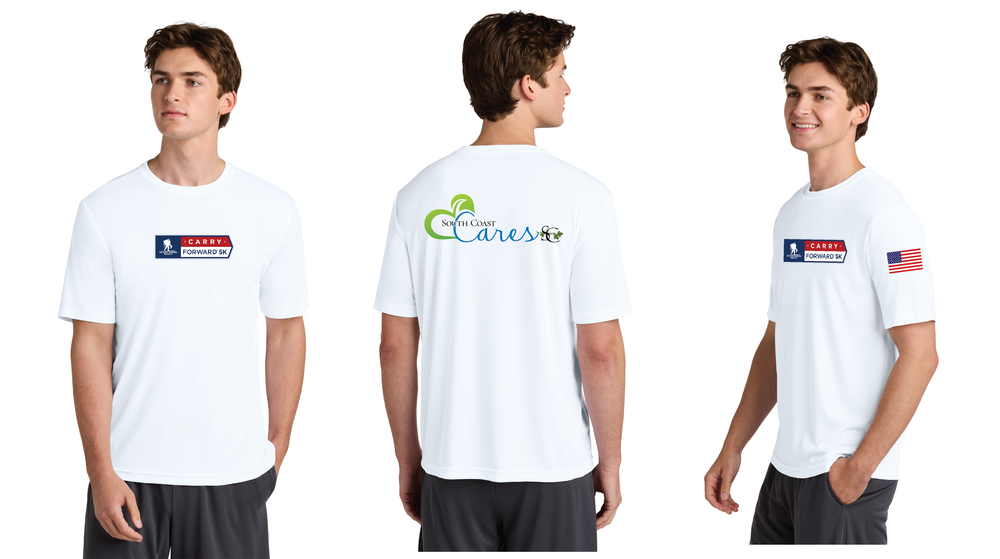 - Logo on the front chest, American flag on the left sleeve and South Coast Cares on the back